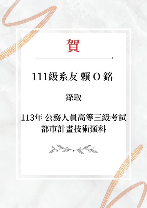 賀 本系學生錄取 113年專門職業及技術人員 高等考試 都市計畫技師 110級 蔡O元
