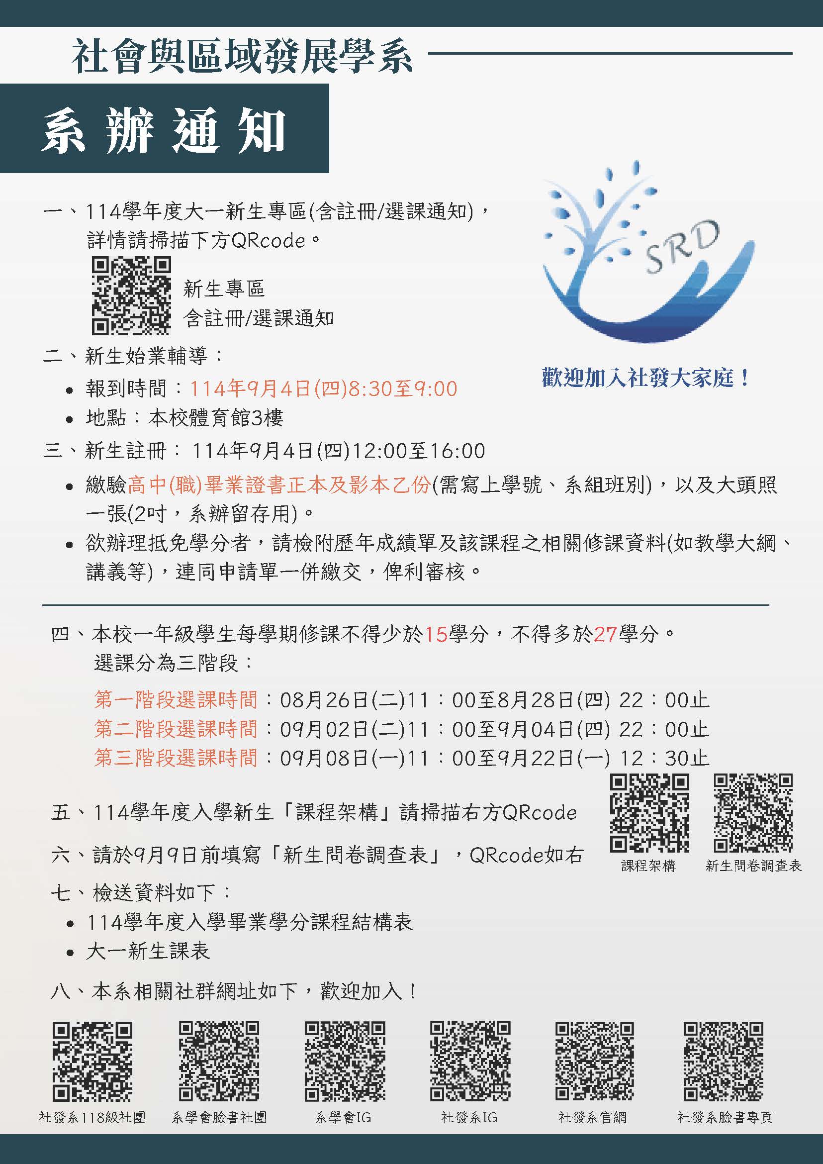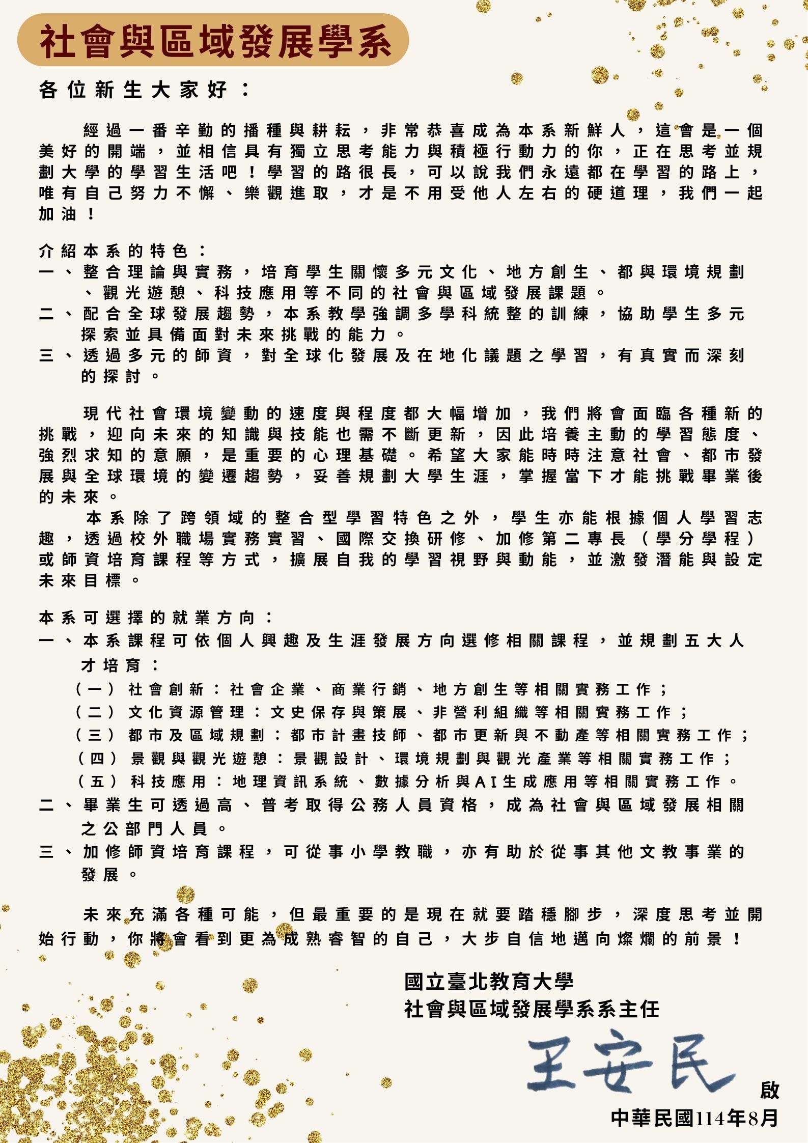 致114學年度入學學士班新生(118級)~系主任的一封信暨系辦通知